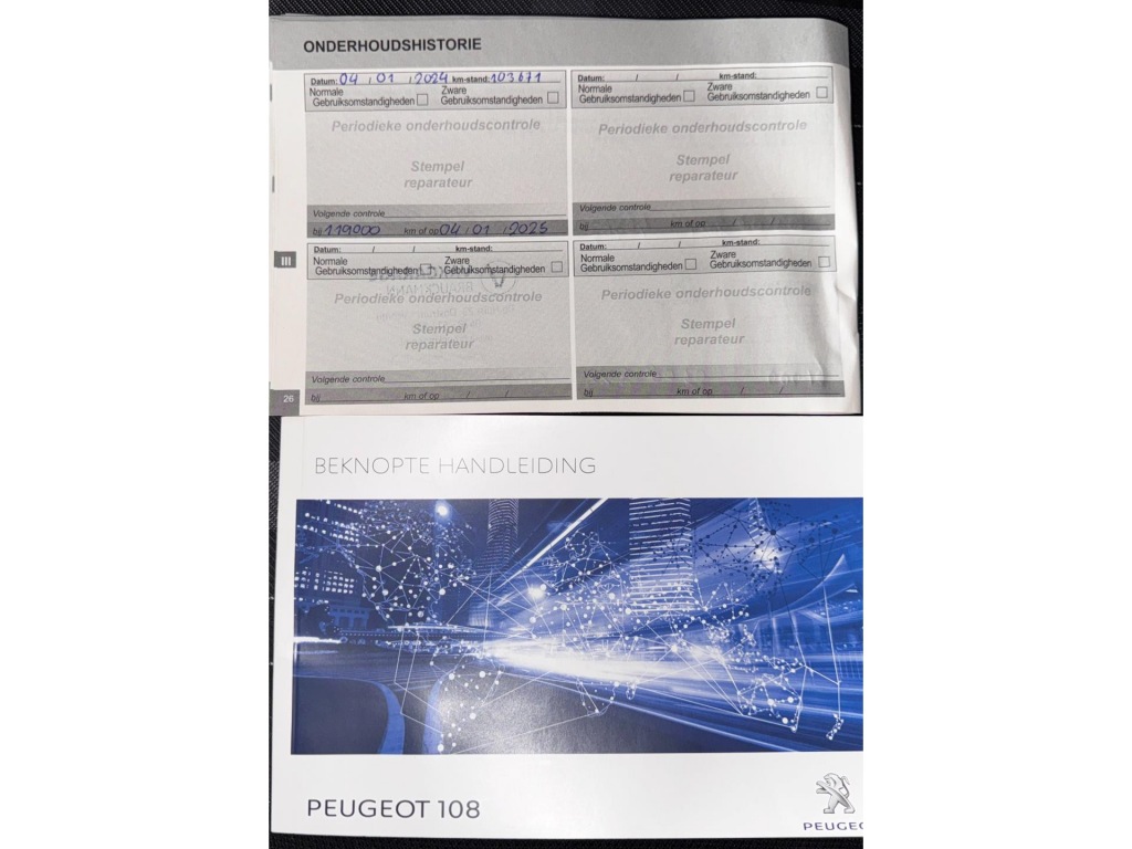 Goed onderhouden Peugeot 108 1.0 Active. N.A.P. aanwezig. Origineel NED-108. Onderhoudsboekje aanwezig. Bij 103.671 KM laatste onderhoudsbeurt gehad. Auto word te koop aangeboden in opdracht voor een collega autobedrijf i.v.m. overlijden eigenaar. Zeer luxe uitvoering met o.a. Airco, Bluetooth, Centrale deurvergrendeling met afstandsbediening, Elektrisch pakket en nog veel meer.